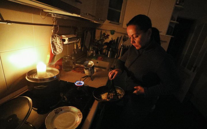 Жінка підігріває вечерю на газовому пальнику під час вимкнення електроенергії в Києві.